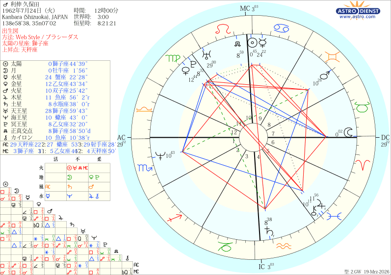 品位の高い天体同士のオポジション。打てば響いてくる様な配置です。獅子の0度にある太陽は、獅子の純粋性が極まって発せられ、土星によって研磨され輝くダイヤモンドの様な太陽です。決めたことをやり抜く精神を持ち、獅子太陽の輝きを発する為に、自己研鑽を重ねる努力の人と言う印象です。
